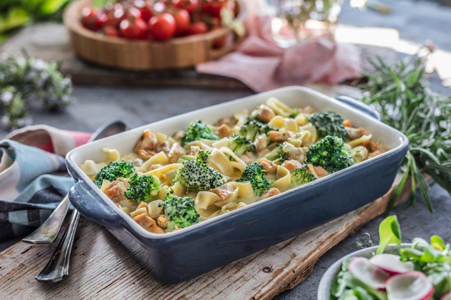 - Piletinu i brokulu rasporedite po tjestenini.