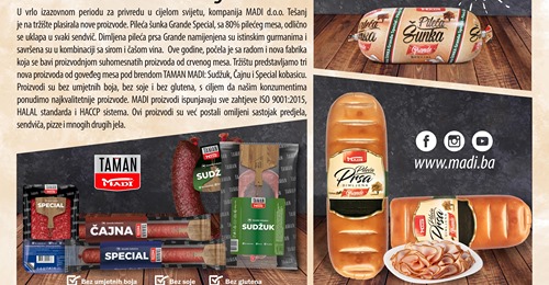 U vrlo izazovnom periodu za privredu u cijelom svijetu, kompanija MADI d.o.o. Tešanj je na tržište plasirala nove proizvode, koji su već postali omiljeni sastojak predjela, sendviča, pizze i mnogih drugih jela. Pileća šunka Grande Special, sa 80% pilećeg mesa, odlično se uklapa u svaki sendvič.
