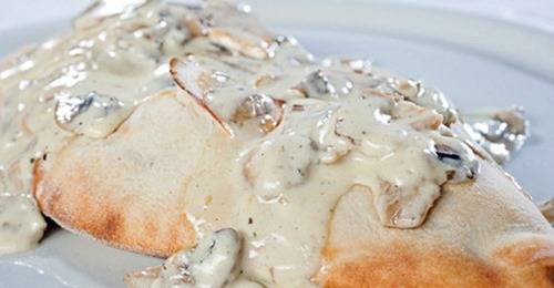 - Dok se pogačice peku, ispržiti luk s gljivama i dodati vrhnje. Ovim sosom preliti pogačice i poslužiti dok je toplo.