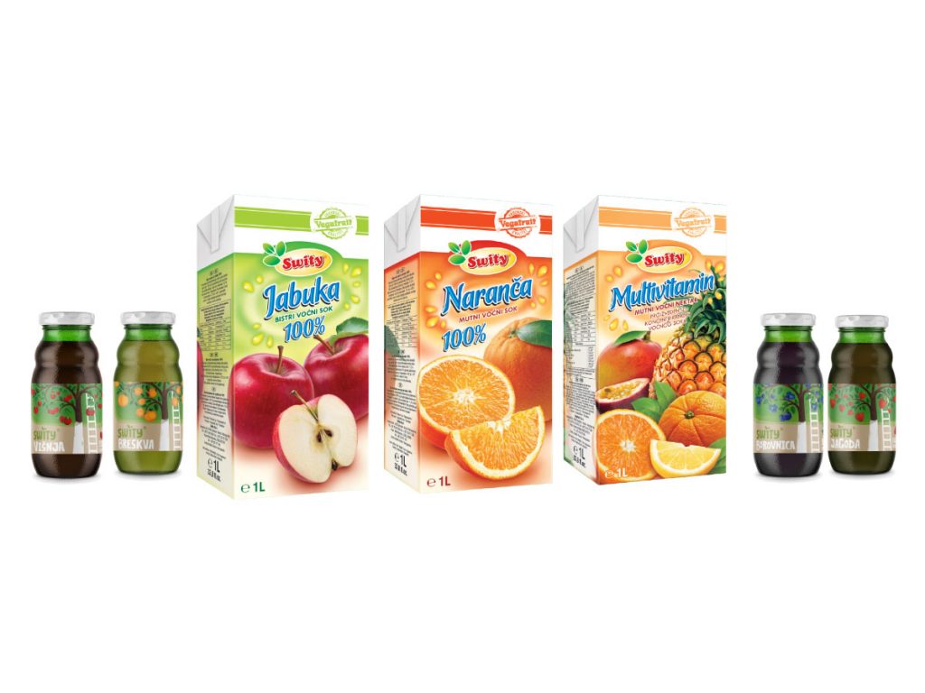 Swity sokovi su prirodni sokovi sa 50% ili 100% učešća voća u svom sastavu. Proizvode se bez konzervansa, bez vještackih boja i bez aditiva, po tradicionalnoj recepturi, iz prirodnih voćnih koncentrata i iz voćnih kaša koje se proizvode u vlastitoj režiji. Swity sokovi su idealan način za zadovoljavanje dnevne potrebe za voćem i vitaminima koje crpimo iz voća. Swity sokovi koji u svom sastavu imaju 100% voća se proizvode bez dodatka šecera, te pri konzumaciji mozete osjetiti pravi prirodan okus jabuke i narandže.