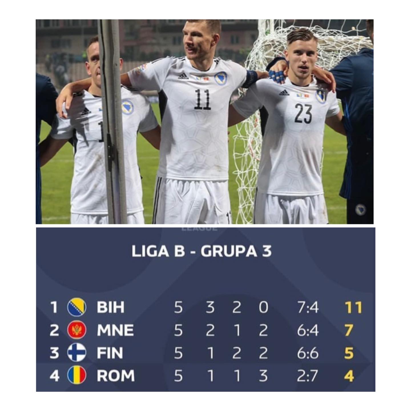 Reprezentacija Bosne i Hercegovine pobijedila je večeras na prepunom stadionu „Bilino polje“ u Zenici selekciju Crne Gore rezultatom 1:0 (1:0) u okviru 5. kola UEFA Lige nacija i sa tri osvojena boda osvojila prvo mjesto u grupi B3 i obezbijedila plasman u Ligu A.