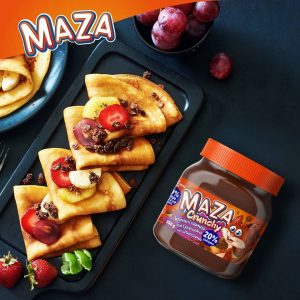 Umutiti jaja, mlijeko, maslinovo ulje, šećer i vodu. U masu dodati brašno i mutiti do željene gustoće mase za palačinke. Na kraju dodati rastopljeni maslac i umutiti. Banane isjeći na kolutiće. Palačinke ispeći na klasičan način, namazati Maza kremom, staviti na njih bananu, posuti lješnjacima i zarolati. Dekorisat sa cijelim i sjeckanim lješnjacima.